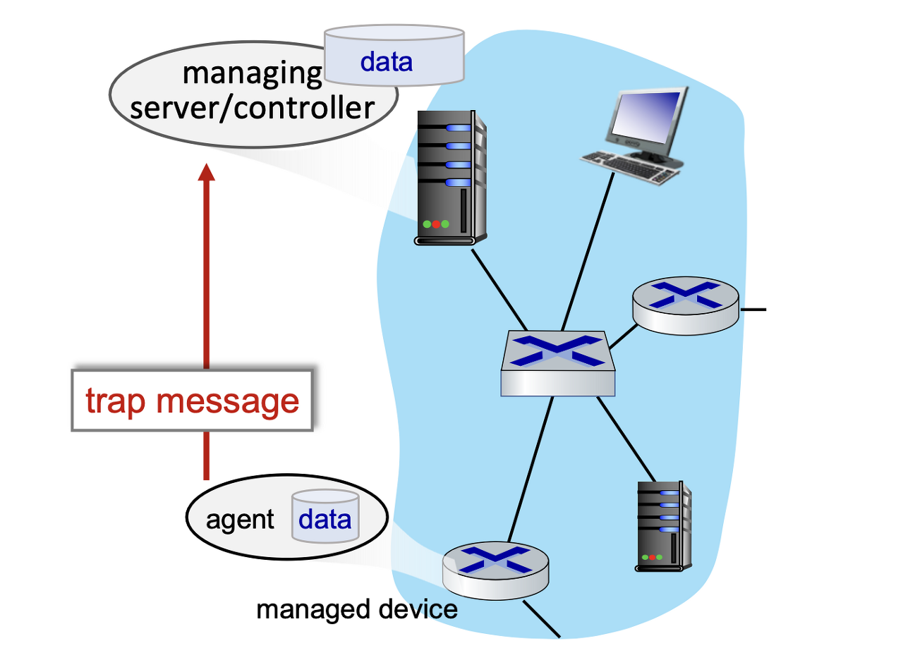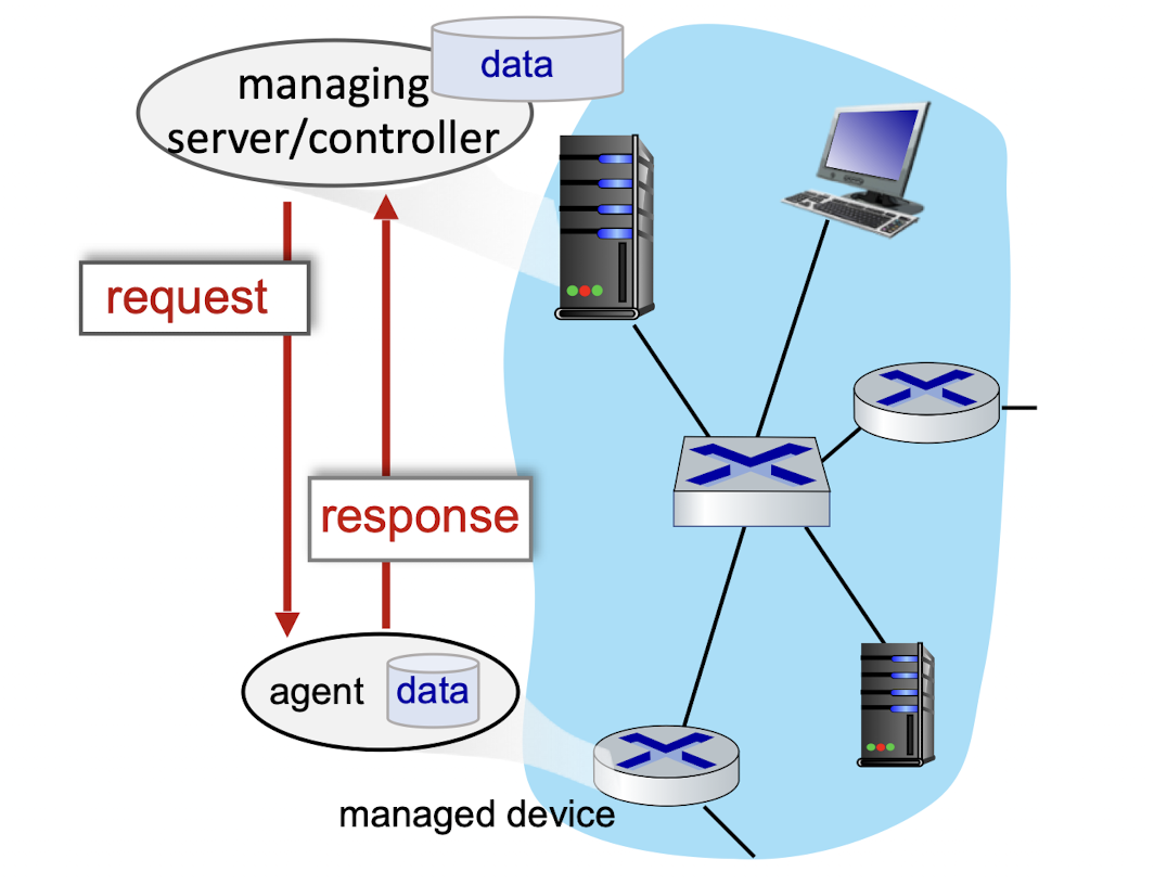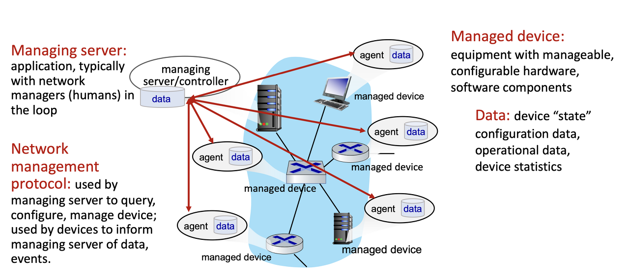 - managed devices: 관리 대상 네트워크에 존재하는 장비들(host, router, switch, middle boxes)