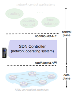 SDN은 프레임워크로 network control(path selection algo 구현 + middlebox at brain)을 하는데, 이는 인터넷 고객의 패킷이 최종적으로 통과하는 단순하고 빠른 네트워크 장치(data plane)와 구별되고 멀리 떨어져 있는 서버(network-control app, layer of control plane)에서의 정교한 소프트웨어인 high-level(northbound) API를 사용하여 프로그래밍된다.