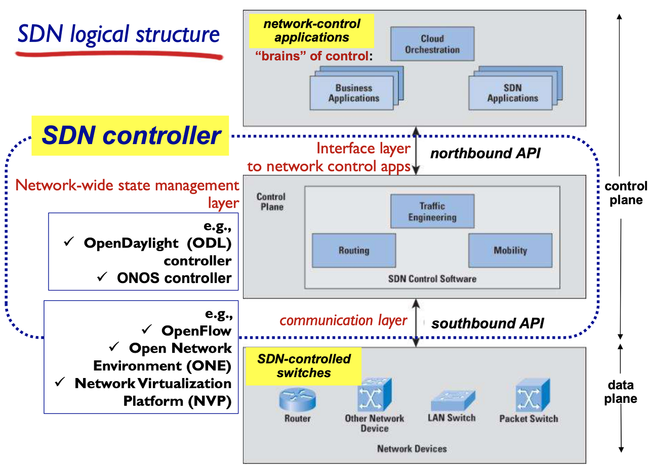 - 2) SDN controller (NW OS) : NW 제어 앱의 출력을 이용하여 패킷 스위치(네트워크 토폴로지 DB 등)를 유지보수/제어합니다.네트워크 어플리케이션과 통신하는 northbound API가 있고, data plane switch들과 통신하는 southbound API가 있다. 성능, 확장성 등의 개선을 위해 분산 시스템 형태로 구현된다. 라우팅테이블에서 best of best를 뽑아 포워딩테이블을 만든다.