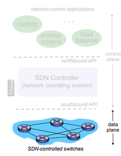 - 3) Packet switches : Simple&Fast, 엔드 호스트의 메시지가 전달되는 H/W로 구성되며, 소프트웨어를 통해 구현된 라우팅 방법에 따라 generalized forwarding을 수행한다. SDN controller와 통신하기 위한 API가 존재하며 대표적인 예시로는 Openflow가 있다.