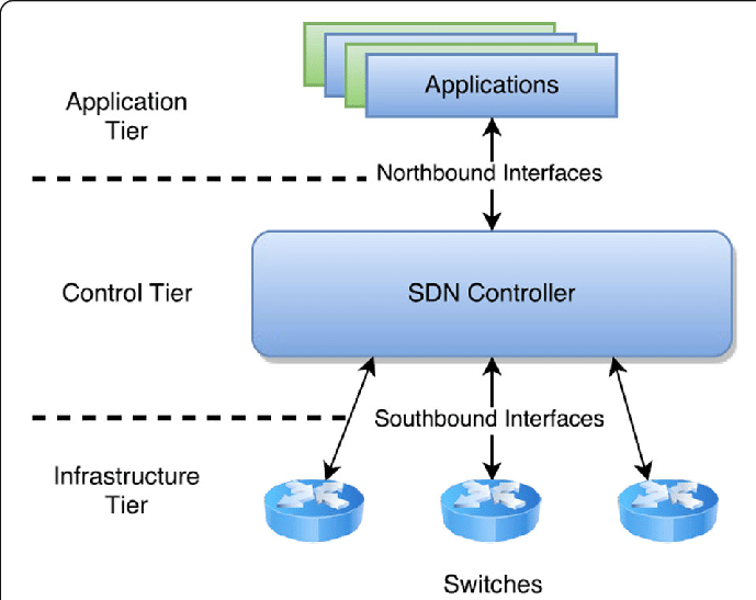 - 1) NW control application layer : Dijkstra의 알고리즘, NAT 알고리즘,로드 밸런서 등 어떻게 동작할 것인지 제어하는 기능을 실질적으로 구현한다. SDN controller에 의해 API를 제공받는다. 라우팅테이블을 만든다.