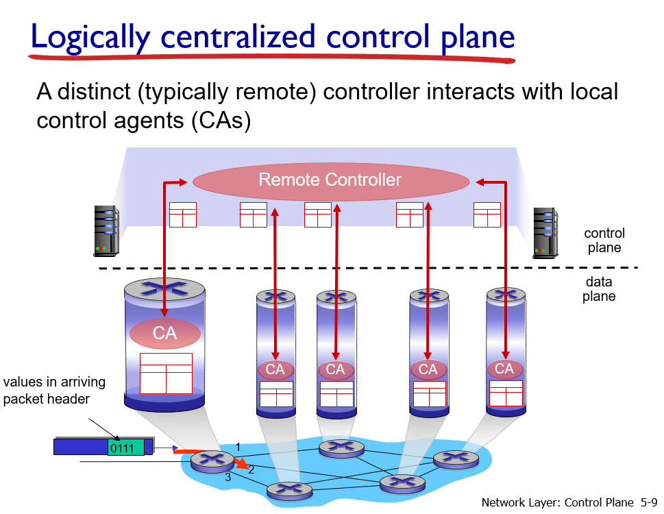 SDN 라우터의 control plane과 data plane을 서로 분리시키고, controller를 중앙화시킨 개념이다. 라우터의 control plane 부분에서 라우팅 알고리즘을 통해 최적의 경로를 계산하고, 계산된 경로에 따라 data plane 부분에서 forwarding을 수행하는 per-router control plane 방식과는 다르게, 최적 경로를 계산하는 controller 부분을 하나로 집중시킨 개념이다. 따라서 라우터는 전송역할(data plane)만 한다.