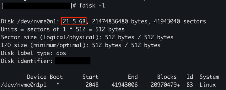 SSD 계열의 디스크 2. 현재 디스크와 파티션 정보를 확인 (disk 사이즈에 20G가 할당된 것을 확인)