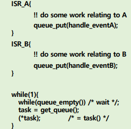 단, 단일 task일 때(=즉 공유하는 데이터가 없을 때 = no ISRs) Simplicity를 장점으로 가진다.