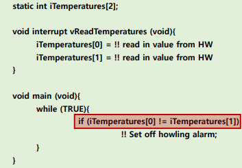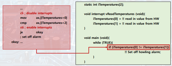 ISR에 의해 shared data가 update되면 불일치성에 유의해야 한다. ISR은 작업 코드에 대한 처리의 일부를 off하기 때문이다.