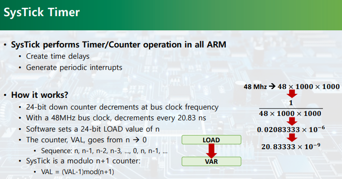 SysTick은 모든 Arm에서 타이머/카운터 작업을 수행해 지속적인 interrucpt를 생성한다.