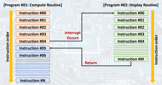 processor는 DISPLAY(interrupt 해결 코드)를 실행하기 위해 COMPUTE #4번(현재 task)까지의 실행을 완료하고 다음 DISPLAY를 수행한다. DISPLAY 실행 전 COMPUTE #4번의 시작 위치를 temporary location에 저장한다. interrupt를 처리하면 COMPUTE #5의 주소로 돌아가 다시 실행하기 시작한다.