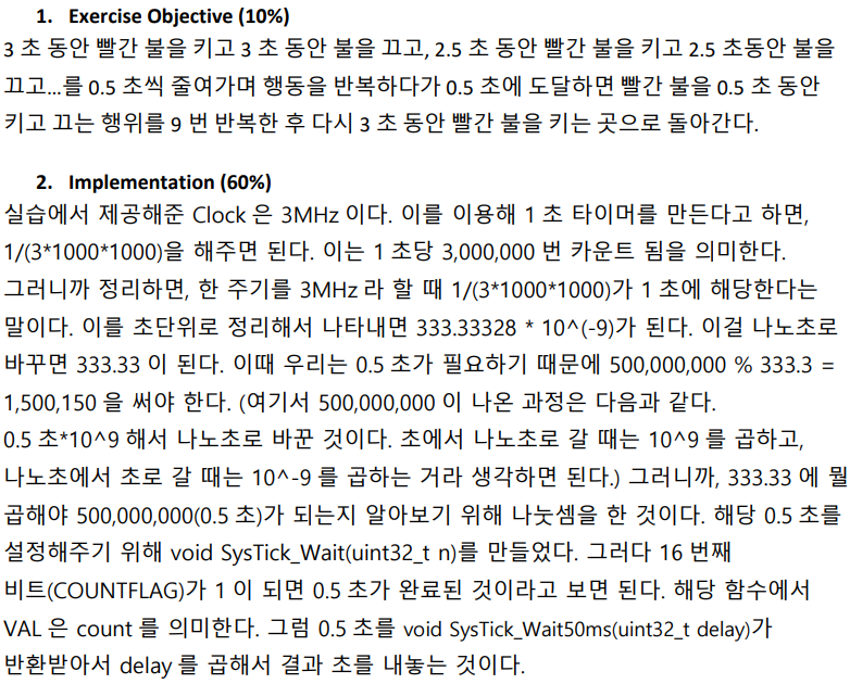 #include "msp.h" #define SYSTEM CLOCK 3000000 //3 초 /** * main.c */ uint32_t i; void SysTick_Init(void){ // 초기값 세팅 SysTick->LOAD = 0x00FFFFFF; // 로드될 때 초기값 SysTick->CTRL = 0x00000005; // 클럭이 동작하도록 세팅 } void SysTick_Wait(uint32_t n){ // 1500150 대입 => 0.5 초를 기다림. SysTick->LOAD = n-1; SysTick->VAL = 0; while((SysTick->CTRL & 0x00010000)==0){} // 16 번째 비트가 1 일 때까지 반복 } void SysTick_Wait50ms(uint32_t delay){ // 6 대입 for(i=0; i<delay; i++){ // 0.5*6 = 3 초 SysTick_Wait(1500150); // 333.3 에 뭘 곱해야 0.5 초가 되는지 대입해서 0.5 초 리턴받음 } } void main(void) { SysTick_Init(); WDT_A->CTL = WDT_A_CTL_PW | WDT_A_CTL_HOLD; // stop watchdog timer P1->DIR |=BIT0; int j; while(1){ P1->OUT = BIT0; SysTick_Wait50ms(6); // 0.5*6 = 3 초 P1->OUT = 0x00; SysTick_Wait50ms(6); P1->OUT = BIT0; SysTick_Wait50ms(5); // 0.5*5 = 2.5 초 P1->OUT = 0x00; SysTick_Wait50ms(5); P1->OUT = BIT0; SysTick_Wait50ms(4); // 0.5*4 = 2 초 P1->OUT = 0x00; SysTick_Wait50ms(4); P1->OUT = BIT0; SysTick_Wait50ms(3); // 0.5*3 = 1.5 초 P1->OUT = 0x00; SysTick_Wait50ms(3); P1->OUT = BIT0; SysTick_Wait50ms(2); // 0.5*2= 1 초 P1->OUT = 0x00; SysTick_Wait50ms(2); for( j=0; j<9; j++){ P1->OUT = BIT0; SysTick_Wait50ms(1); // 0.5*1 = 0.5 초 P1->OUT = 0x00; SysTick_Wait50ms(1); } } }//48Mhz마다 20.83333ns가 감소한다. 48Mhz -> 48 X 1000 X 1000 = 1/(48 X 1000 X 1000) = 0.02083333 X 10^(-6) = 20.83333 X 10^(-9)Event handler란 어떤 이벤트가 발생했을 때, 이벤트를 처리하기 위해 코드를 수행하는 것이다.
