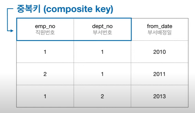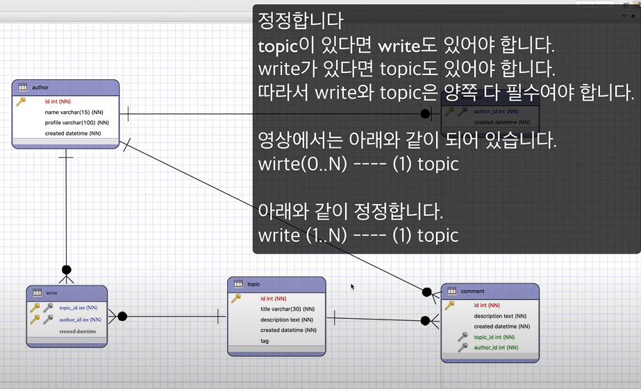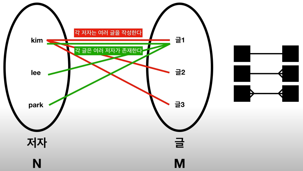 - n:m 관계는 연결 테이블을 만들어 1:n, 1:n으로 이어 해결한다. (단, 연결테이블을 만들 때는 중복될 수 있는 값을 고려해 기본키를 잘 설정해야한다.) ex. user table - write table - post table