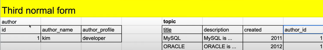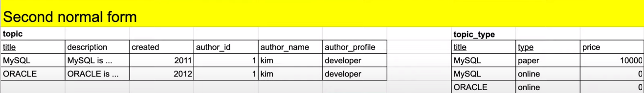 해당 테이블에서 하나의 행은 title(기본키)에 의존하나, author_name과 author_profile은 author_id에 의존하는게 문제 중복되는게 문제다. 테이블을 따로 빼보자.