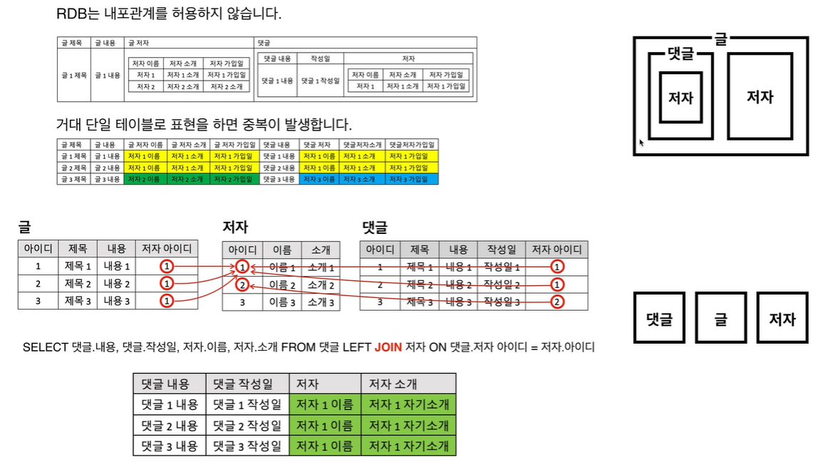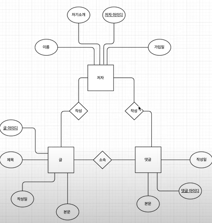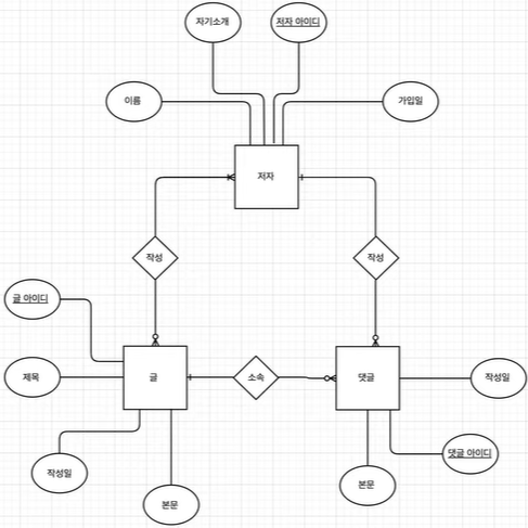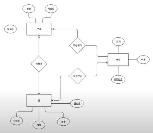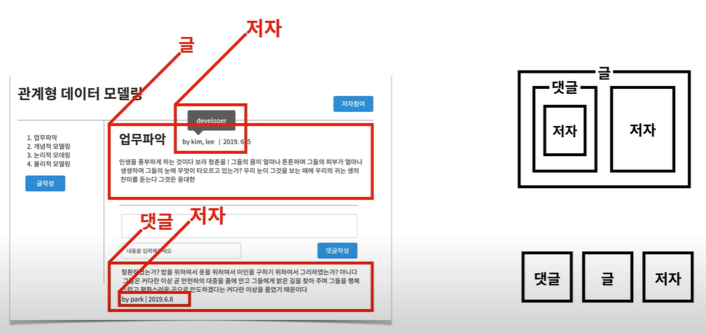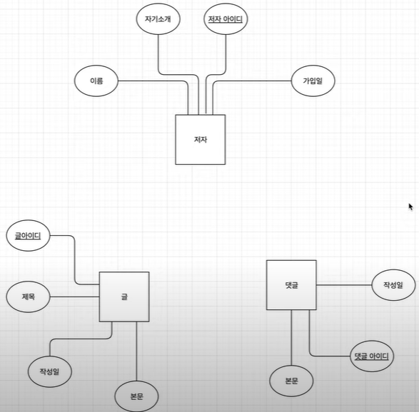 '글'에 '저자'를 속성으로 넣지 않는 이유는, '저자'만의 '저자 소개','저자 가입일' 등의 속성을 가지기 때문이다.