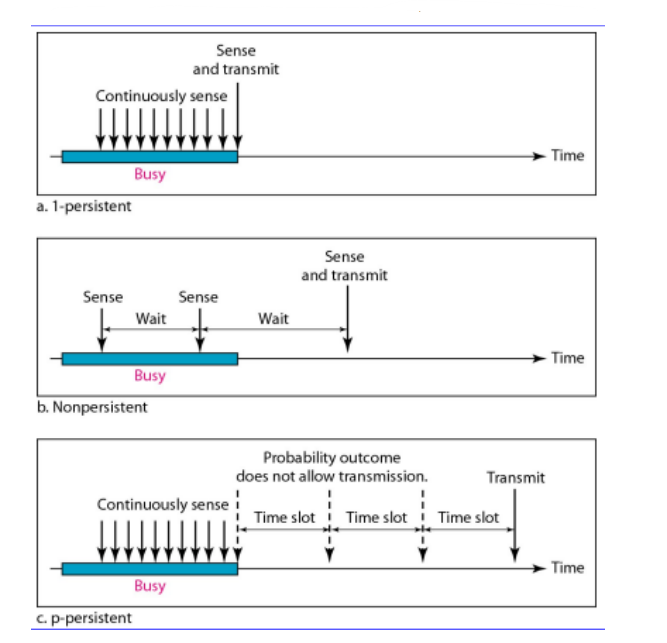 - CSMA/CD 방식이 효과적으로 동작하기 위해서는 (transmission time >= 2*e2e propagation time) 이어야 sending station이 collision을 감지하는 것이 가능하다.