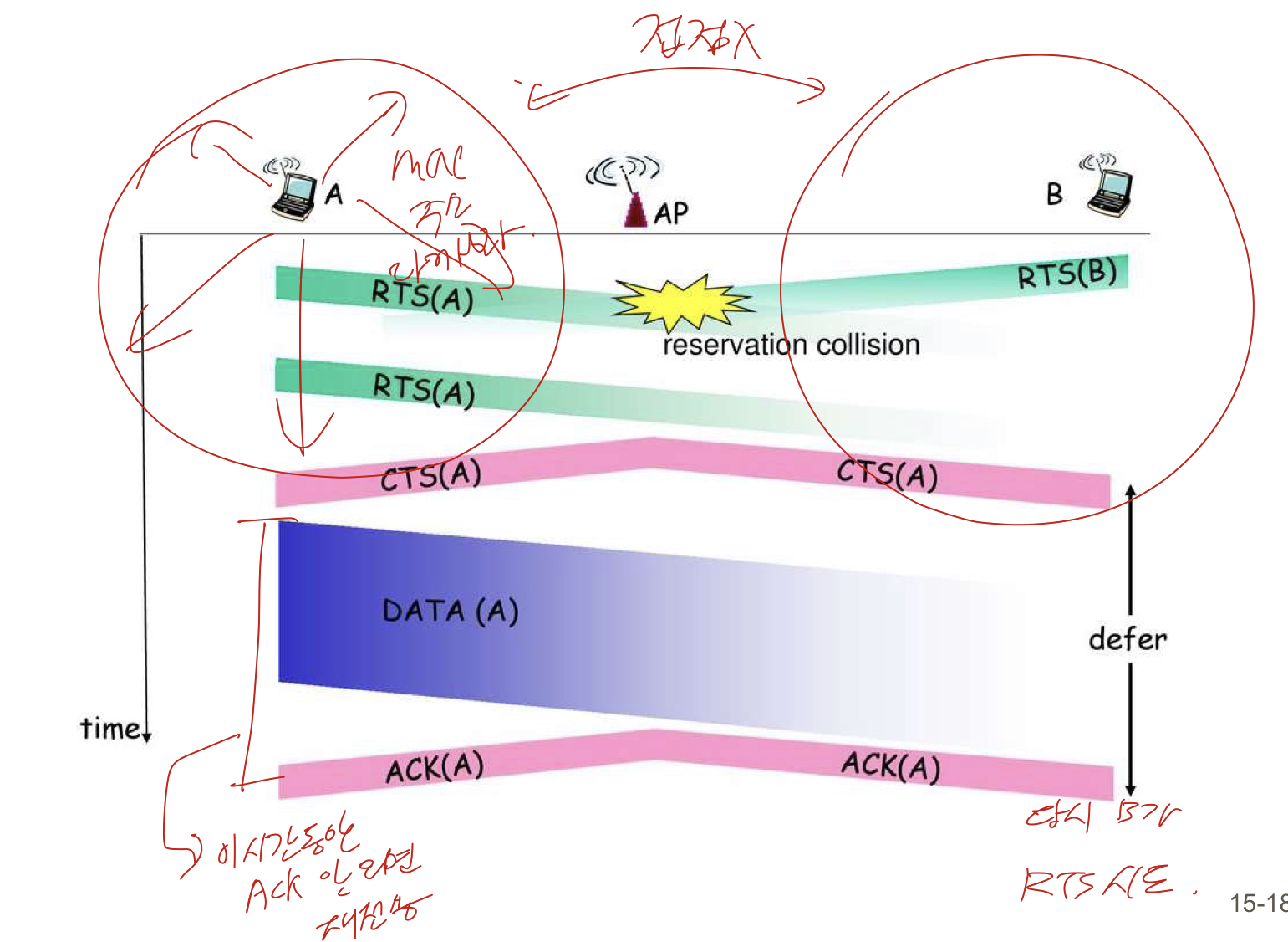 - hidden node problem의 문제: 두개의 station이 동일한 AP(in infrastructure mode)에 연결되어 있는데, 두 station들은 무선통신영역 밖이라 동시에 AP에 전송한 신호를 AP에서 감지하지 못해 충돌나는 문제> error 탐지도 당연히 불가능