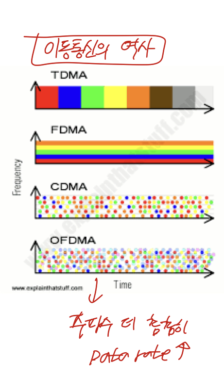 - OFDM, OFDMA 모두 하나의 큰 대역폭 대신 , 주파수를 간섭이 없는 (orthogonal) 작은 대역폭에 해당하는 여러 sub-carrier로 만들고 이를 이용하여 데이터를 전송하는 방식