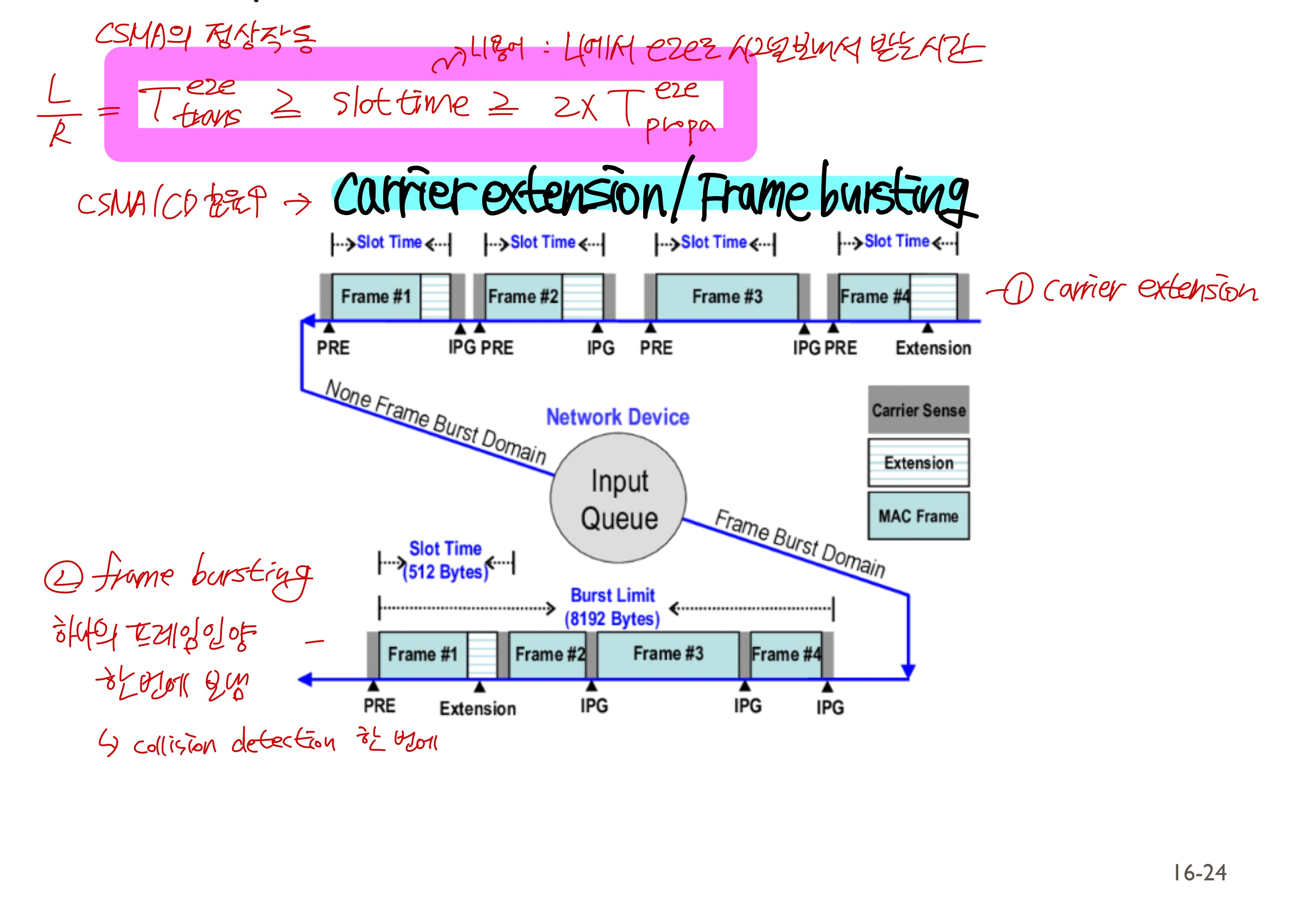 - Carrier extension: mac 프레임의 크기를 늘림(ipg 공간사용)으로써 애초부터 충돌 가능성을 낮춤 => 단 공간낭비로 인한 링크효율 감소 > Frame bursting 방법이 나온 이유