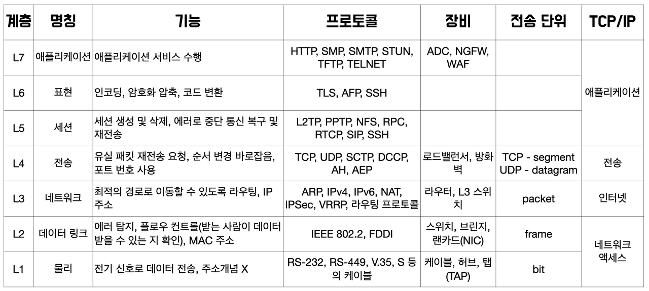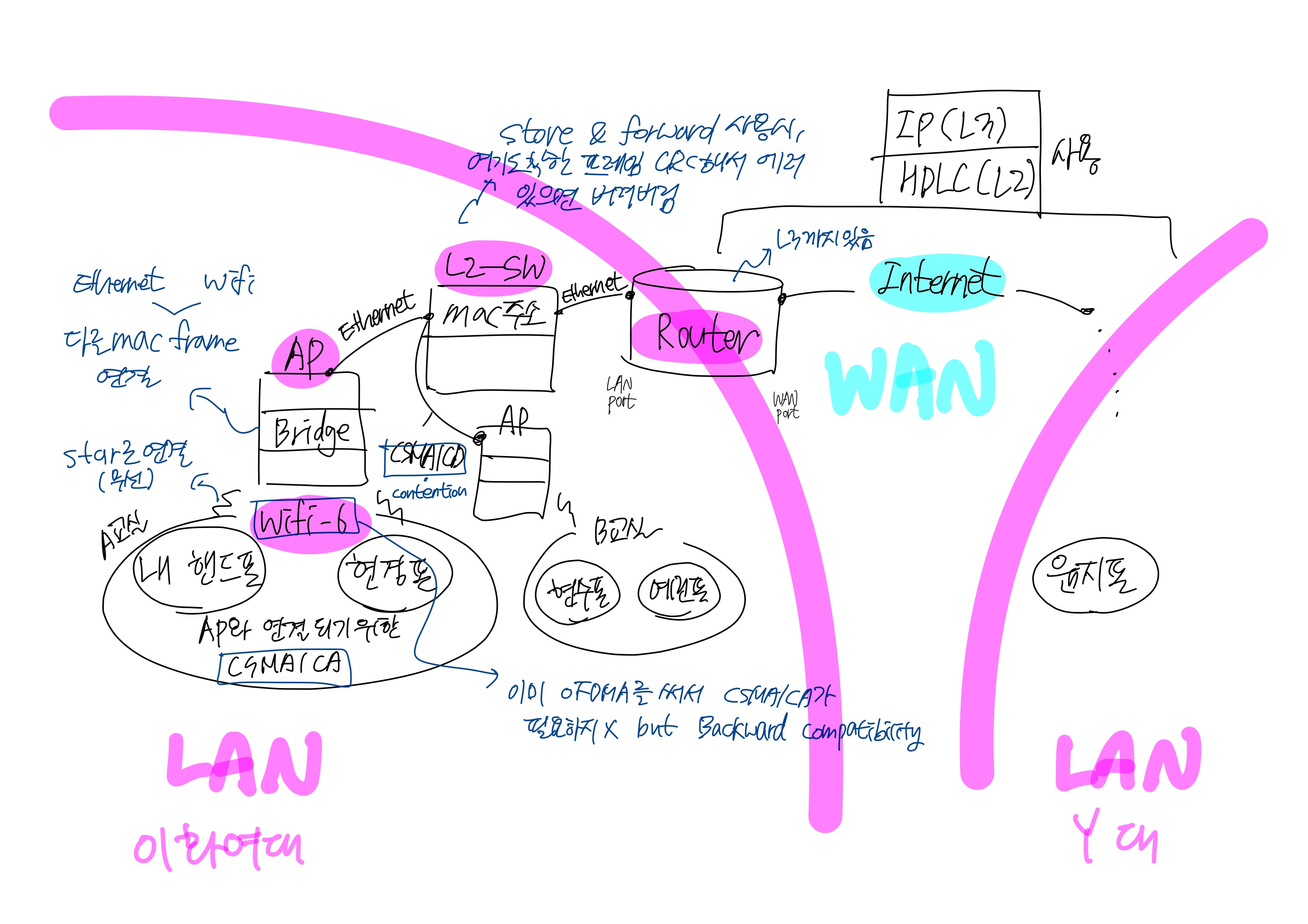 Data link layer: mac addr을 통한 next hop까지의 전달 책임, framing, flow&error&access contorl, bridge, L2-sw