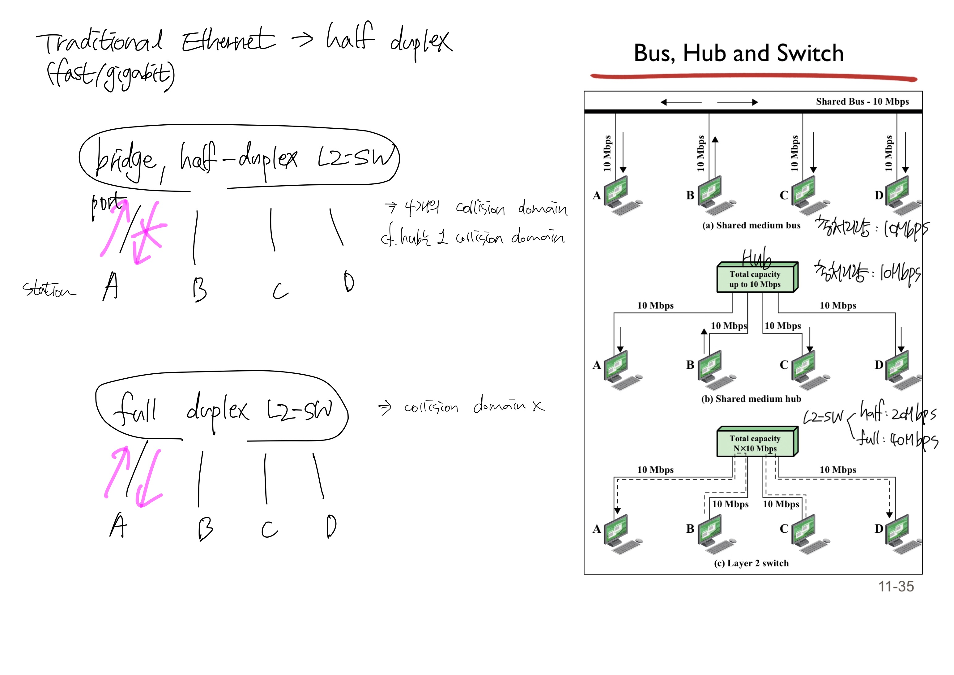 - Full-duplex: 양방향 전송, 동시 가능 => 충돌X니 12장의 충돌알고리즘과 상관이 없다