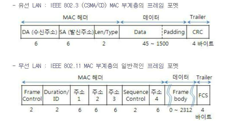 - Infrastructure WLAN에서는 데이터를 주고, 받는 source station(찐 내주소)과 destination station의 MAC 주소는 각각 신호를 전송하는 노드와 신호를 수신하는 노드의 MAC address와 일치하지 않는다.