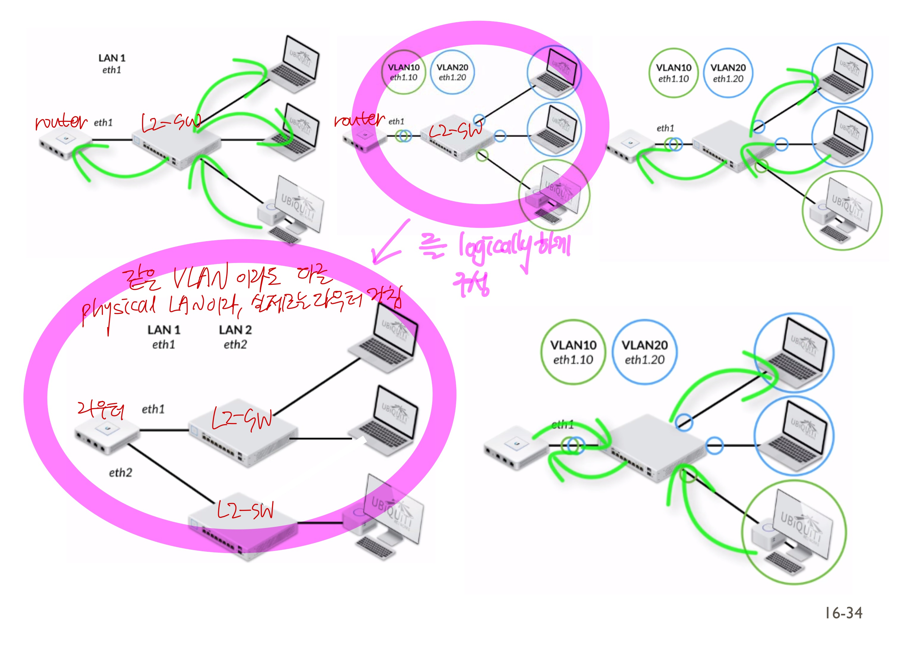 - 서로 다른 VLAN에 속한 station들 간의 통신은 반드시 L3 routing, 즉 IP address 기반 routing이 필요하다. 이를 위해 라우터 혹은 Layer-3 switch가 필요하다. (L3-SW 는 MAC 주소기반 L2 routing과 IP 주소 기반 L3 라우팅을 모두 할 수 있으나 기존의 라우터에서 하는 edge 기능 (firewall, NAT, Tunneling, QoS 등)이 없으므로 LAN과 WAN의 경계에 사용되지 않는다.)