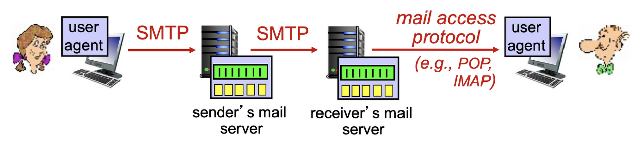 cf. sender와 receiver가 직접 연결을 맺지 않고, 메일서버를 통해 전달하는 이유는 연결에 오류가 있을시 alice의 메일 서버가 bob의 메일서버 오작동을 대비할 수 있다는 점과, 매번 client에서 DNS resolution을 해야 하는 대신 두 메일 서버를 연결한다면 DNS를 재사용 할 수 있어 효율이 좋다. 즉, 이렇게 하면 메일 서버의 IP 주소를 찾는 DNS resolution 횟수를 줄일 수 있다는 장점이 있다. 또한 alice가 속한 ISP에서 Bob이 속한 ISP로 보내는 다른 메일들을 동시에 전송할 수 있어 효율성이 좋다.( + alice가 bob과 caki에게 메일을 보낸다면, tcp를 연김에 연달아 보낸다.)