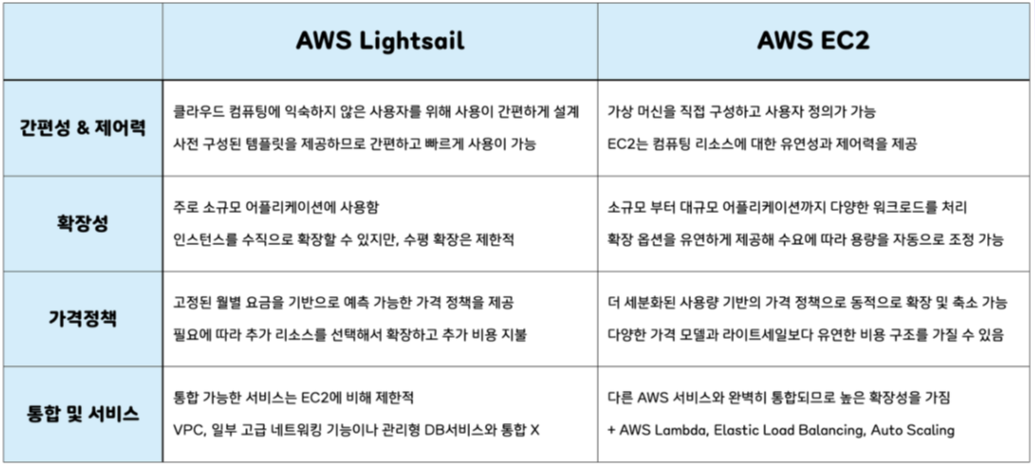 가격에 따라 정해진 CPU, 메모리, 디스크 용량을 선택하게되고 정해진 가격만큼만 과금된다. 만약, 한달 내내 실행시키되 트래픽이 많지 않다면 EC2가 아닌 Lightsail가 더 적합하다.
