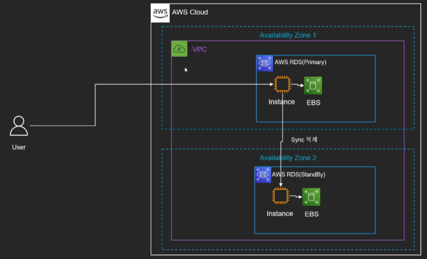 다중 AZ 구성은 현재 서비스되는 RDB에 문제가 생겨도 다른 AZ에 있는 RDB로 빠르게 장애 복구를 시킴으로써 가용성 및 내구성을 높여주므로 프로덕션 데이터베이스 워크로드에 적합하다. 다중 AZ설정시 AZ별 인스턴스에는 마스터 DB로부터 Sync 복제가 일어난다. 여러개의 RDS이지만, 하나의 DNS만 바라본다. 즉, 하나의 DNS 이름으로 통신하여 마스터 DB에 문제가 생기면 자동으로 Stanby DB로 DNS를 옮겨 장애조치를 취하는 것이다. 이때 Stanby DB에는 DNS가 없어서 접근 불가능하다. read replica도 다중 AZ로 생성할 수 있다. 이를 통해 단일 AZ와 다르게, 다운타임이 없으므로 DB를 중지시킬 필요가 없으며 서로 동기적 복제를 한다.