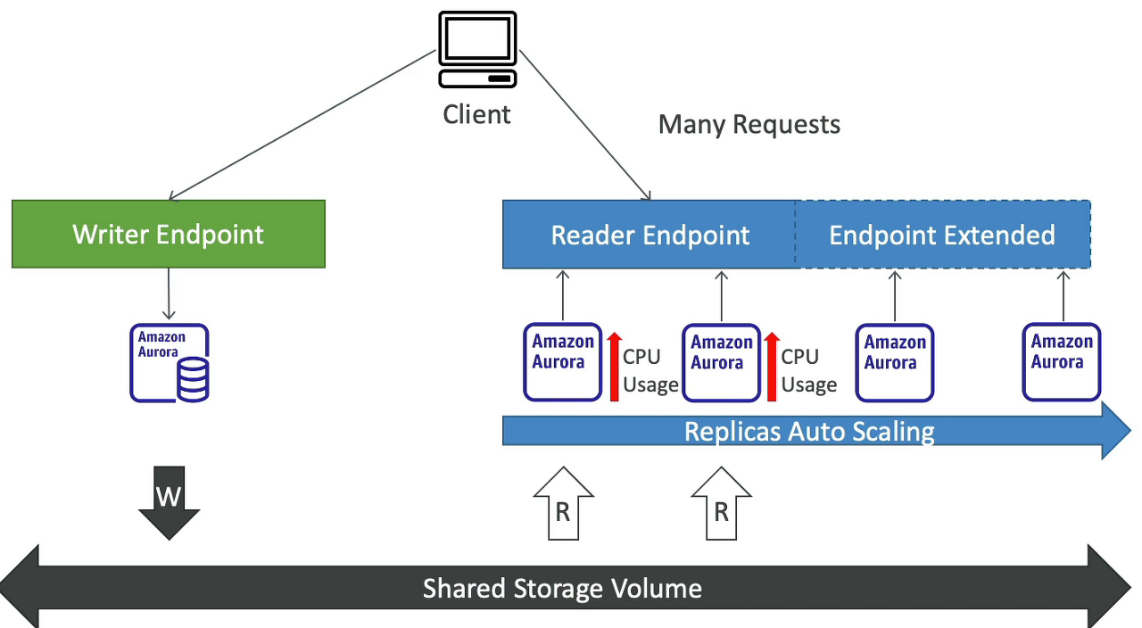 Reader 엔드포인트로 많은 요청이 들어오면 자동 스케일링 하여 트래픽을 분산시킨다.